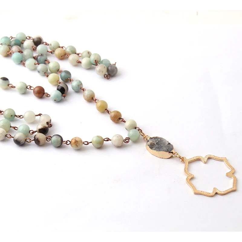 New Fashion Bohemian Tribal Jewelry Beads Halsband Amazonite Stones Natural Druzy Flower of Life Pendan