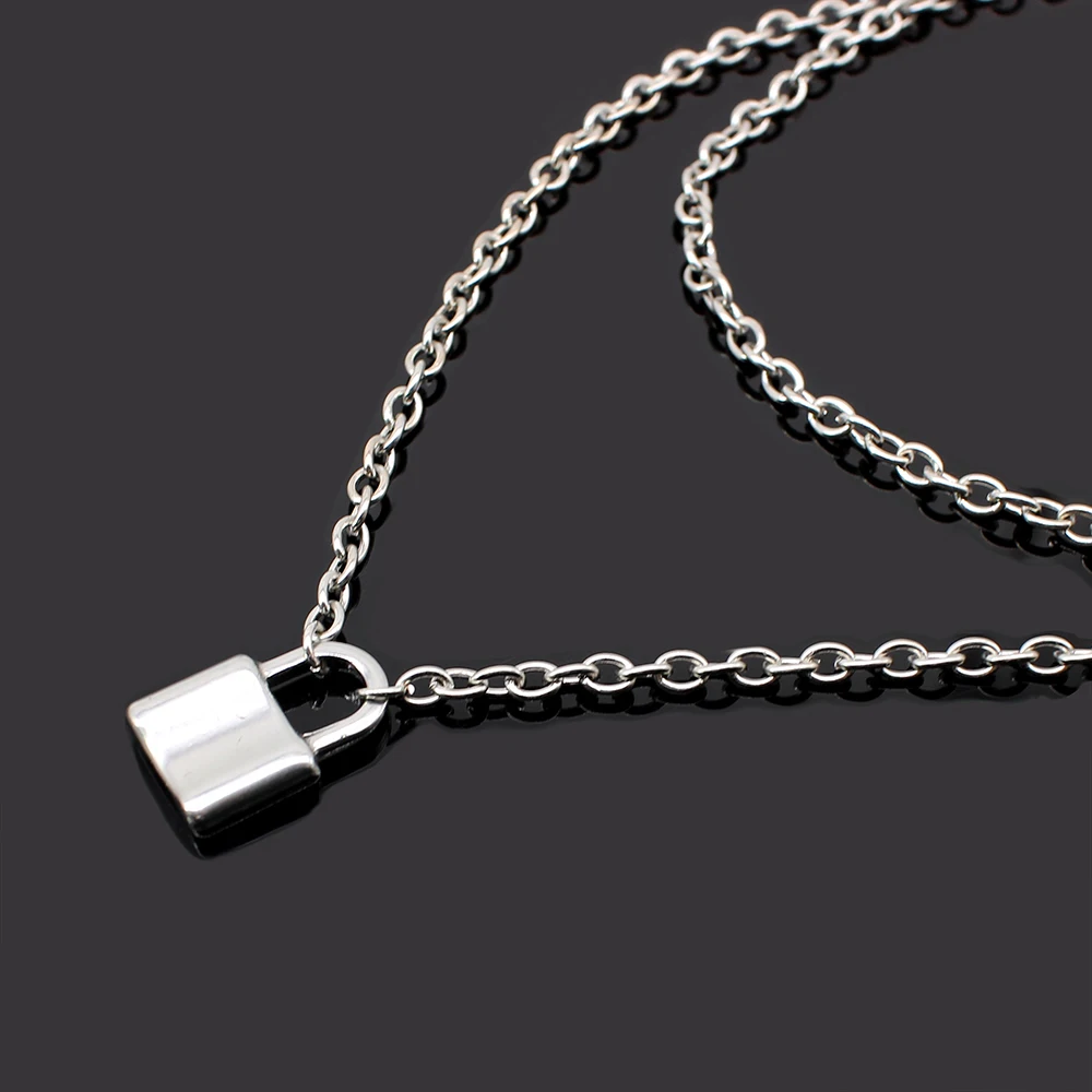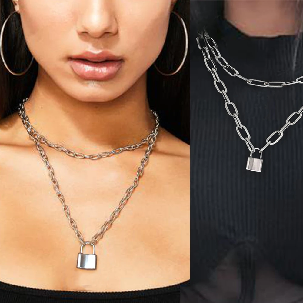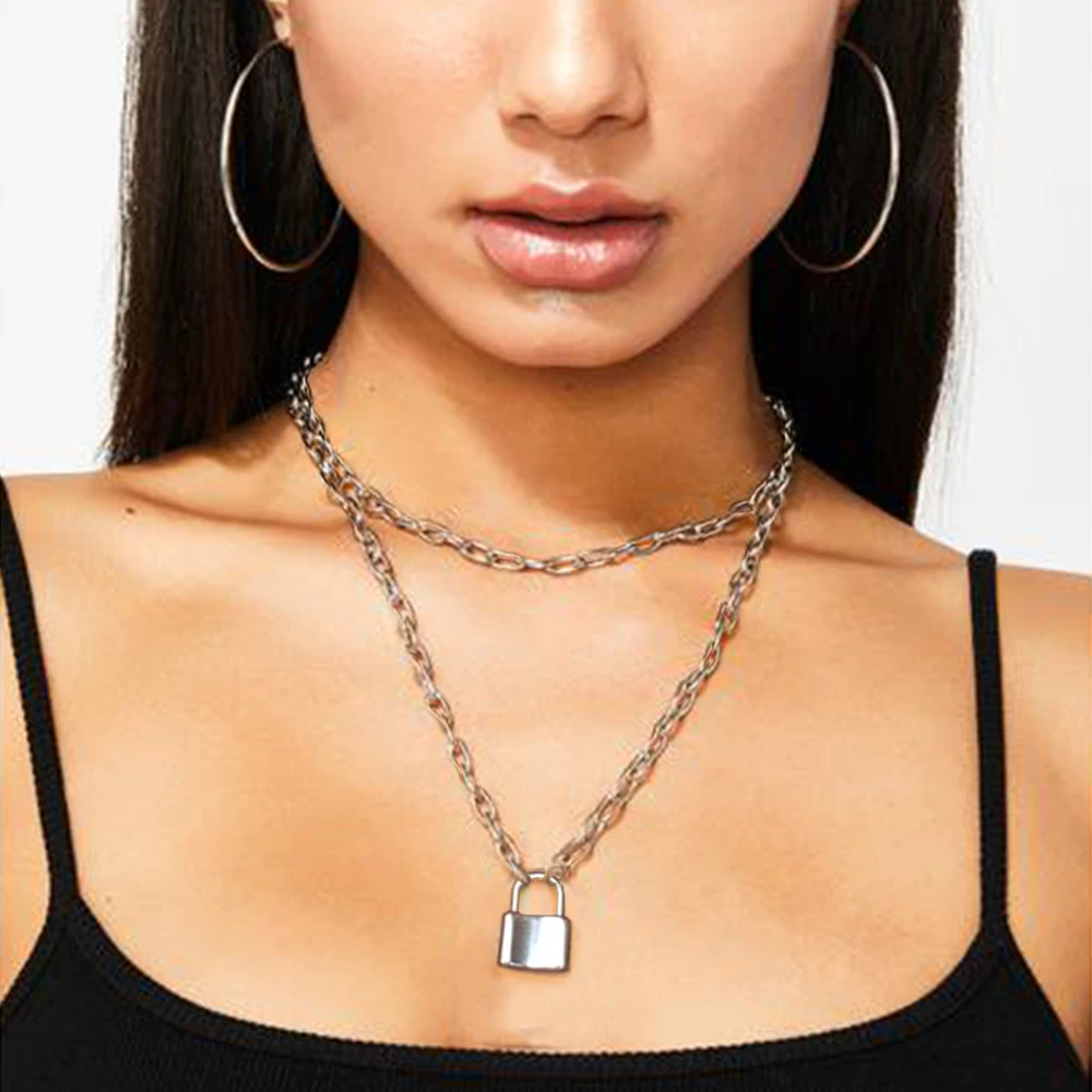 Buy Punk Double Layers Lock Chain Necklace Women Gothic Link Chain Stainless Steel Metal collar Padlock