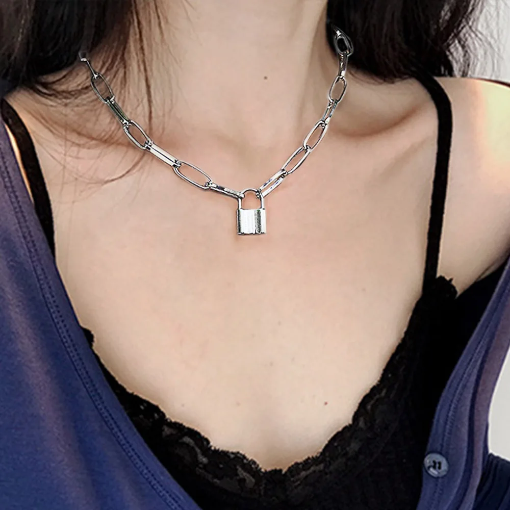 Best Punk Double Layers Lock Chain Necklace Women Gothic Link Chain Stainless Steel Metal collar Padlock